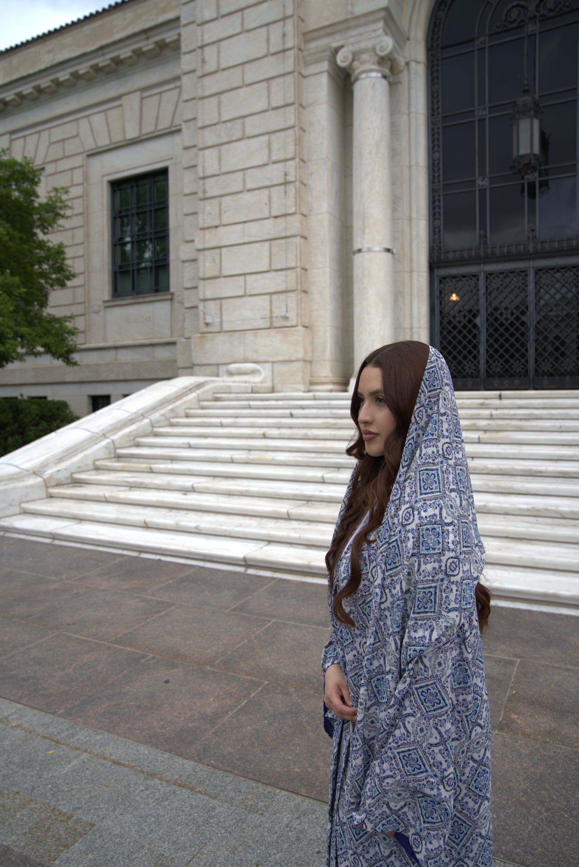 Step into elegance with Mary’s Mosaic, a 3-piece abayah set designed with artistry and intention. The open abayah is crafted from lightweight chiffon and features a stunning mosaic tile pattern in shades of navy blue, sky blue, lavender, and soft ivory — a blend of calm tones and timeless detail.