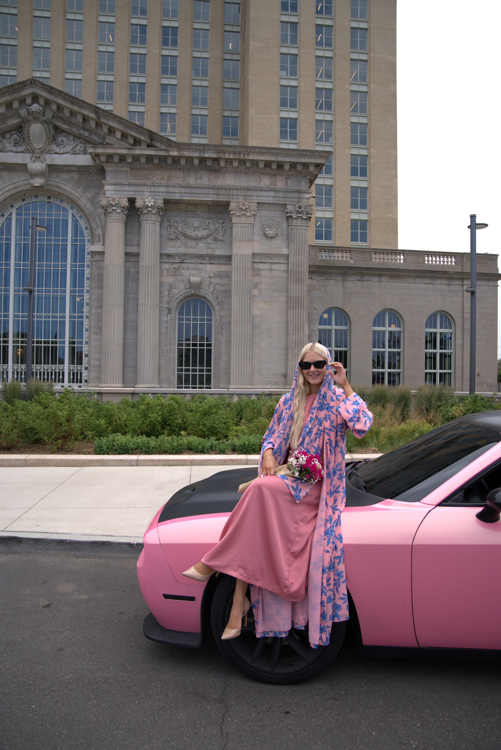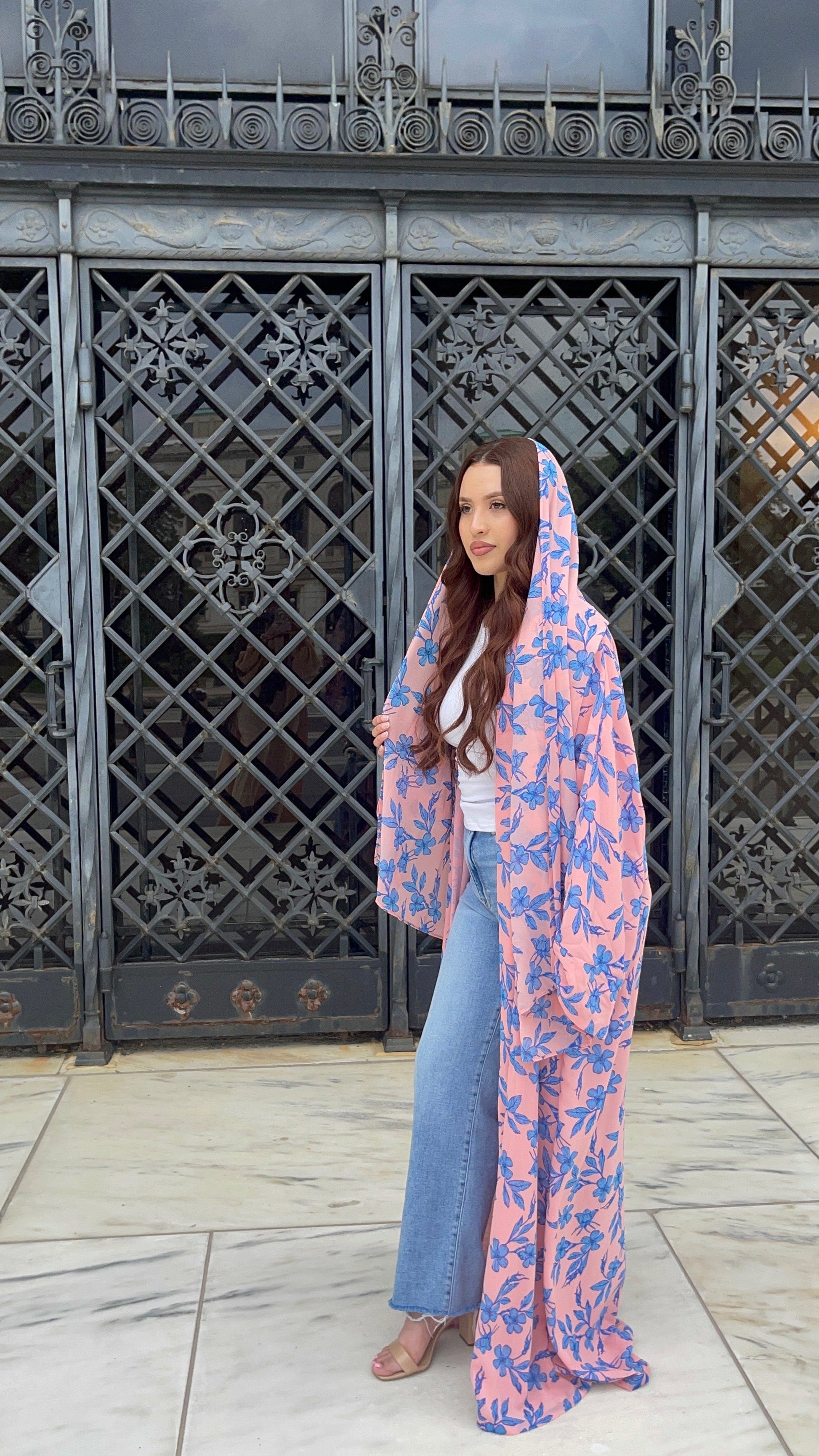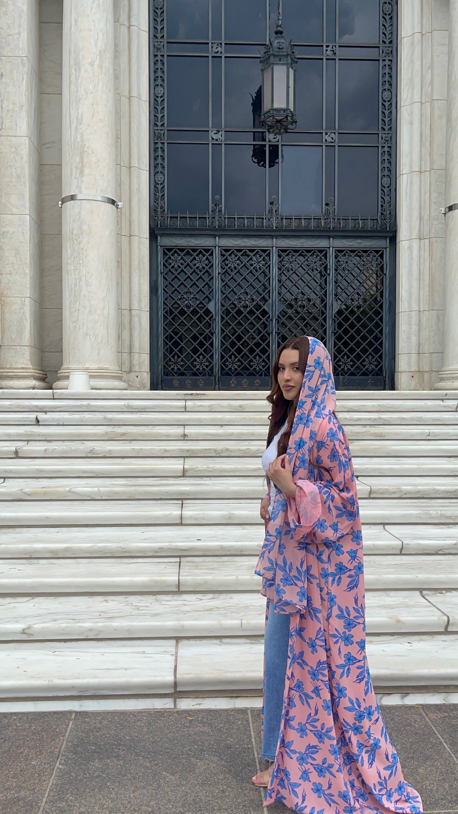 Fresh, feminine, and full of life — Pink Spirulina is a 3-piece abayah set designed to turn heads while staying rooted in effortless modesty. This open-front chiffon abayah features a soft pink base adorned with bold blue botanical prints, creating a vibrant yet elegant contrast that radiates energy and grace.