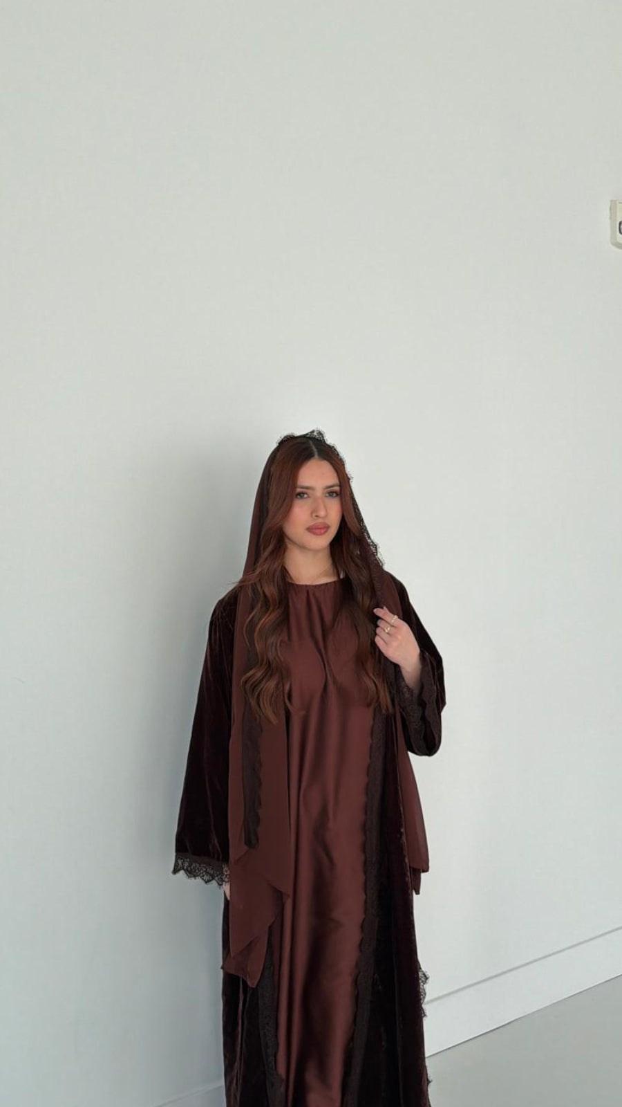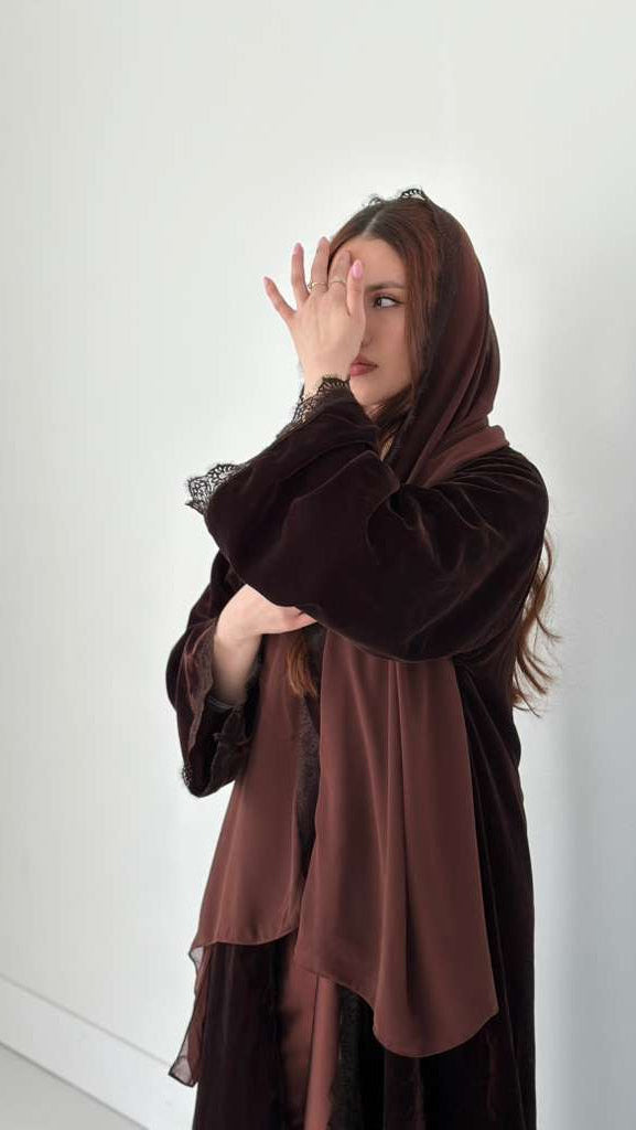 The Velvet Ganache Abaya is a three-piece set featuring a velvet outer abaya with lace trim, a satin slip dress, and a chiffon hijab finished with lace trim. Designed for a polished, elevated look.